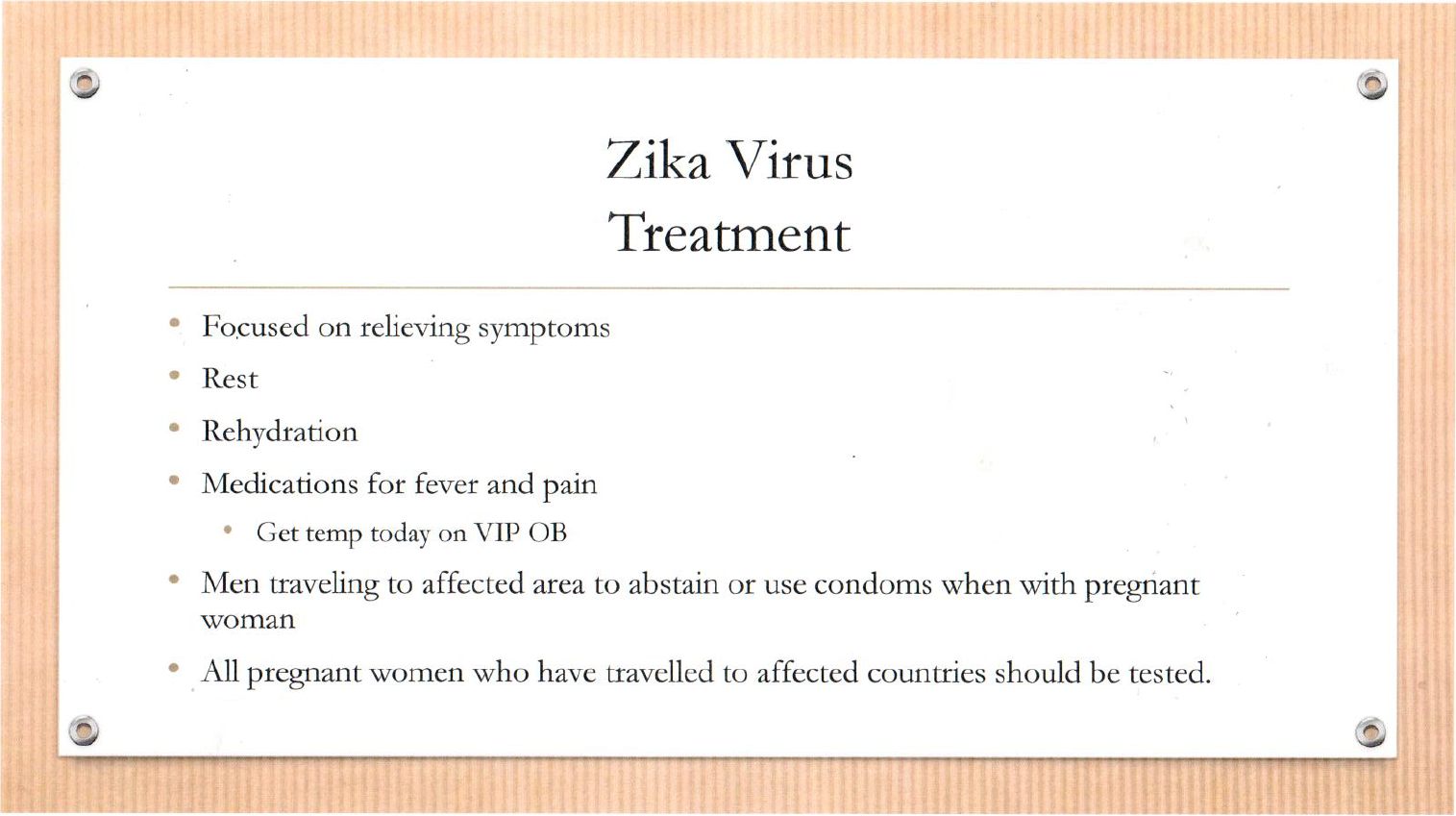 Staff Training: Zika Virus Posted on February 8, 2016October 7, 2016 by Kimberly WrightEvery Monday morning we have staff training to make sure that we continue to give you the best possible care. Today we discussed the Zika Virus. Here we share a few of our training slides. Are you planning on doing any travel soon?